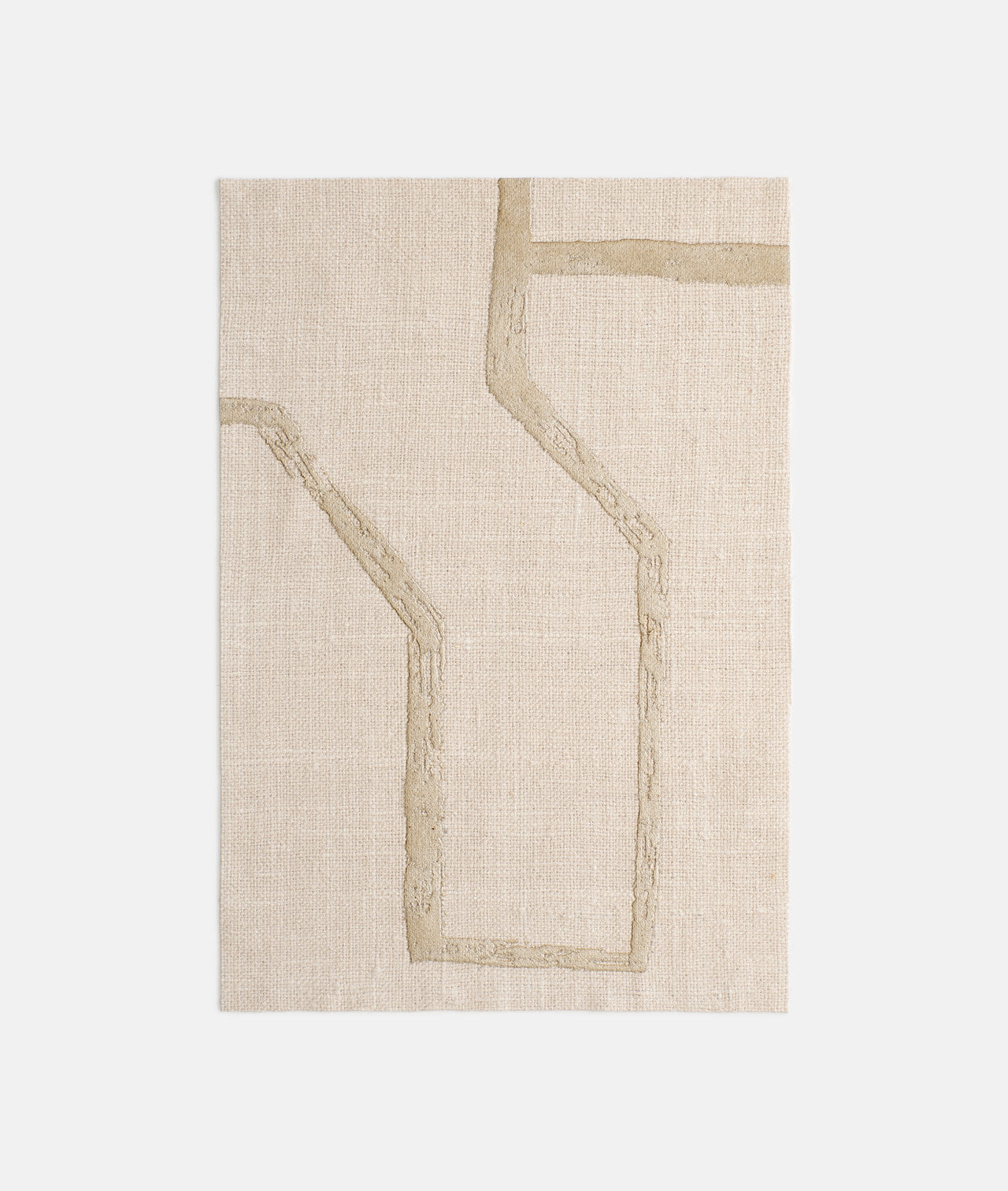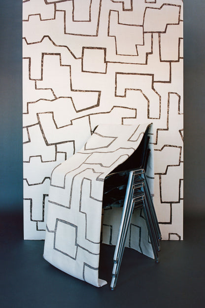 Rivestimento murale “Dimodong” firmato Dedar Milano, una seta matka murale stampata a quadro con effetto gesso. Il disegno spezzato ricorda corpi dipinti da popoli lontani.