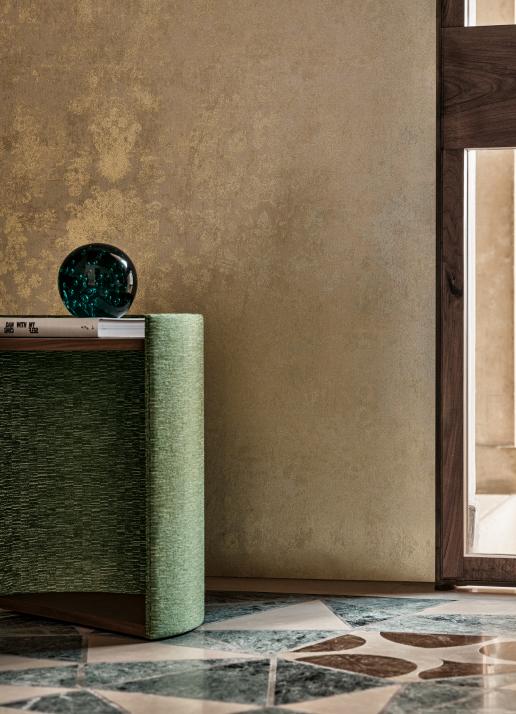 Rivestimento murale tessile “Eliodoro” firmato Rubelli Venezia; traduzione dal tessuto al murale, ha l’aspetto di un pizzo metallico prezioso. Il disegno è grande, ma senza superbia, per una decorazione discreta; richiama l’effetto di una vecchia decorazione murale dalla superficie ossidata, abrasa.