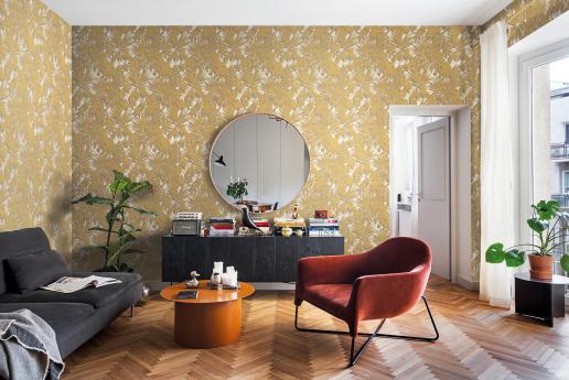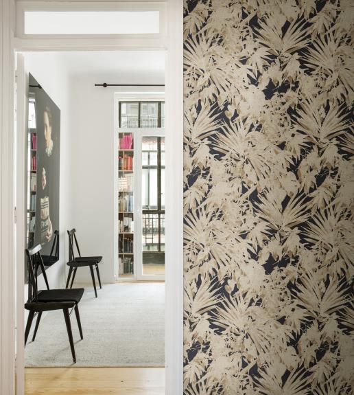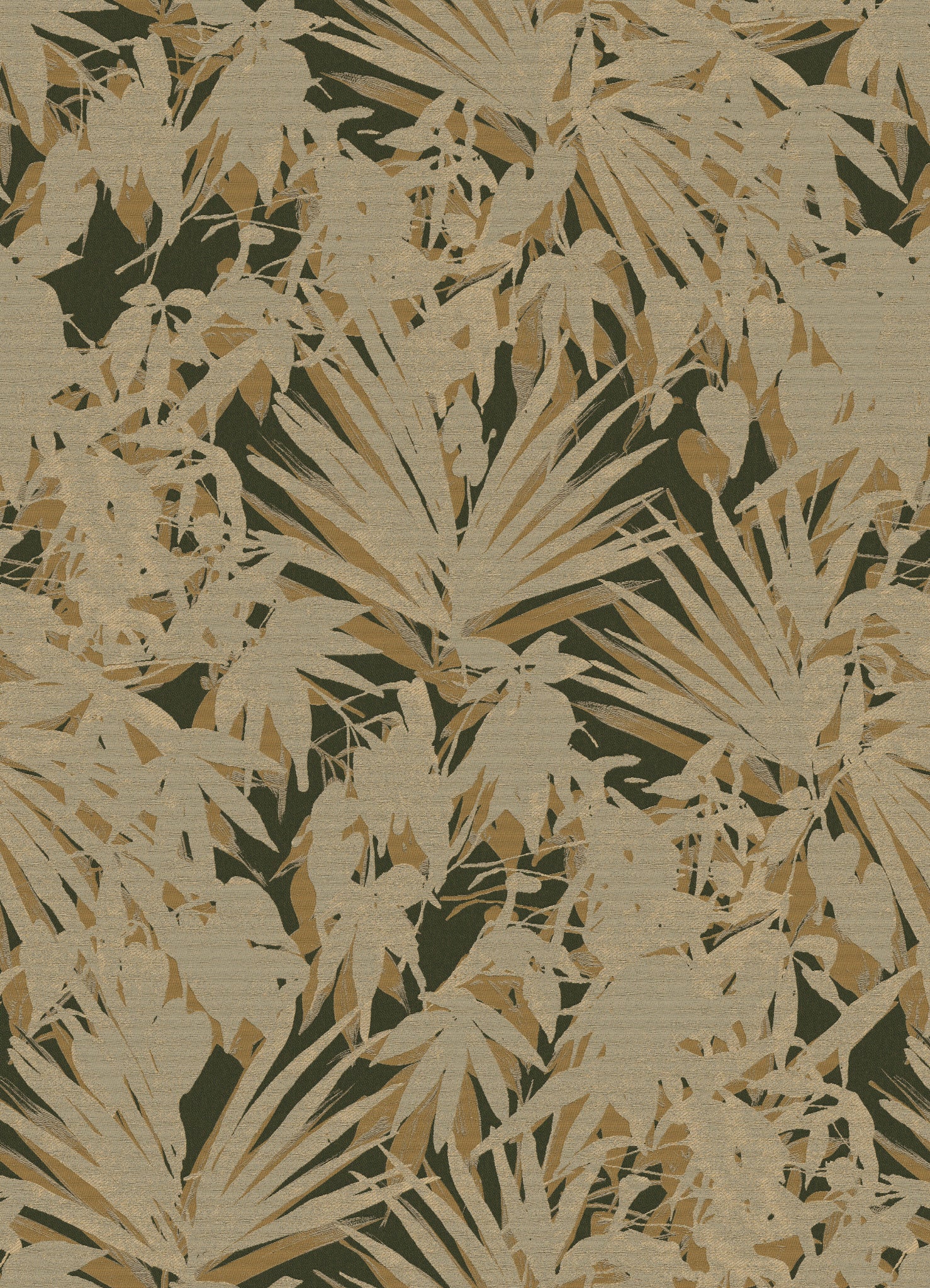 Carta da parati "Java" firmata Rubelli Venezia, disponibile in 4 varianti di colore, la sovrapposizione di silhouettes metalliche ed opache ricorda le lacche giapponesi. In primo piano elementi di vegetazione dalle forme aggraziate, forse Kenzie. (venduta a rotoli di 10 m h 70 cm)