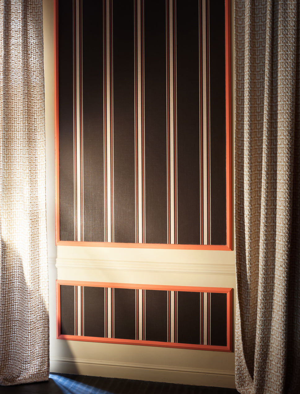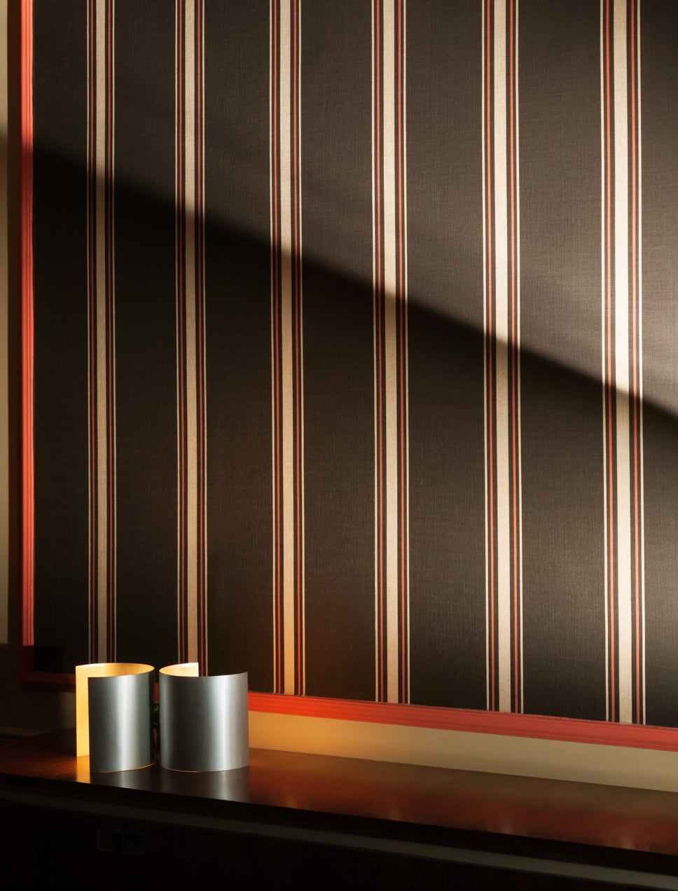 Carta da parati “Library” firmata Dedar Milano, realizzata in juta e arricchita da ampie righe colorate. Disponibile in 5 varianti di colore.
