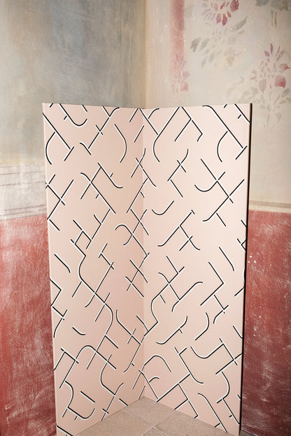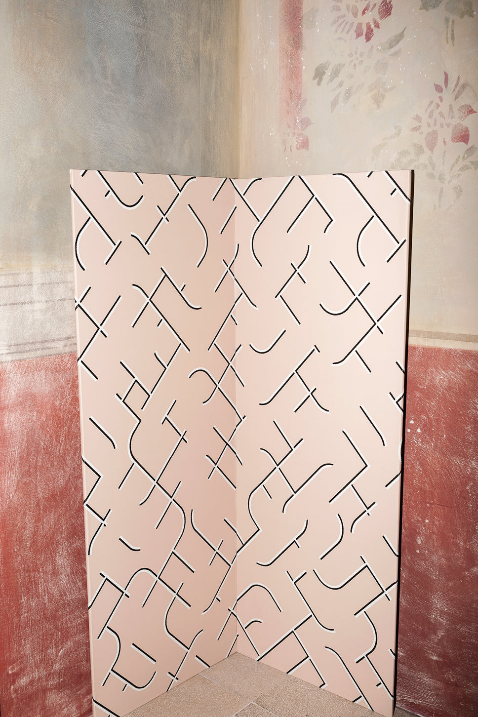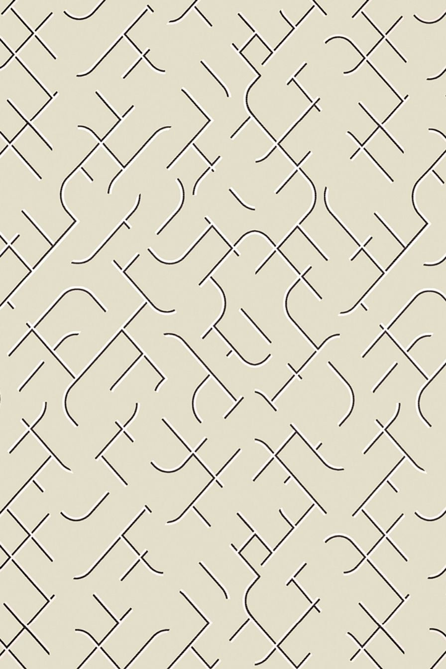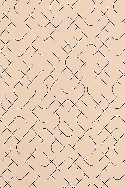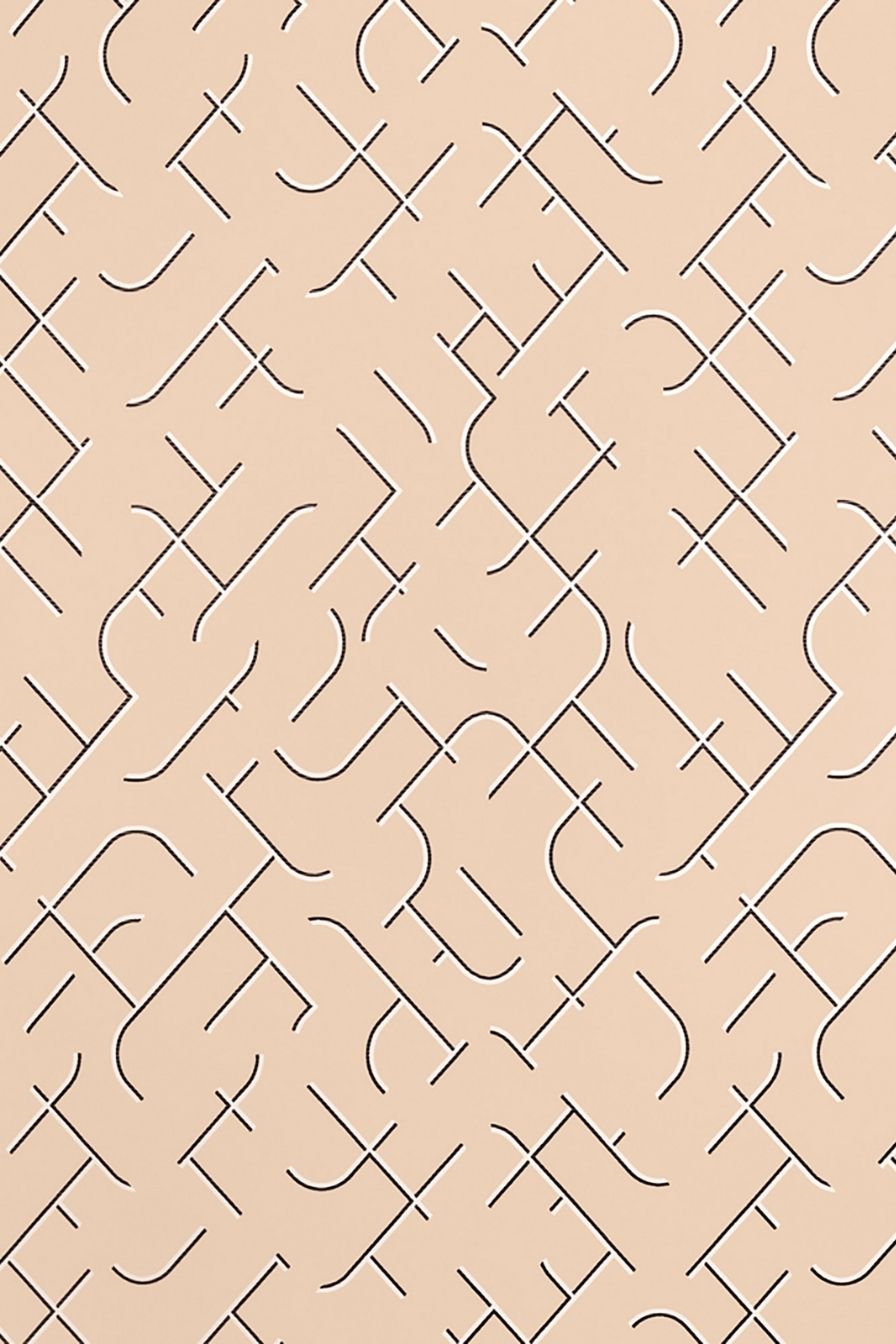 Carta da parati tridimensionale “Rosetta” firmata Dedar Milano, disegno particolare simile a un ideogramma o una calligrafia ancora da decifrare; disponibile in 3 varianti di colore.