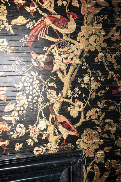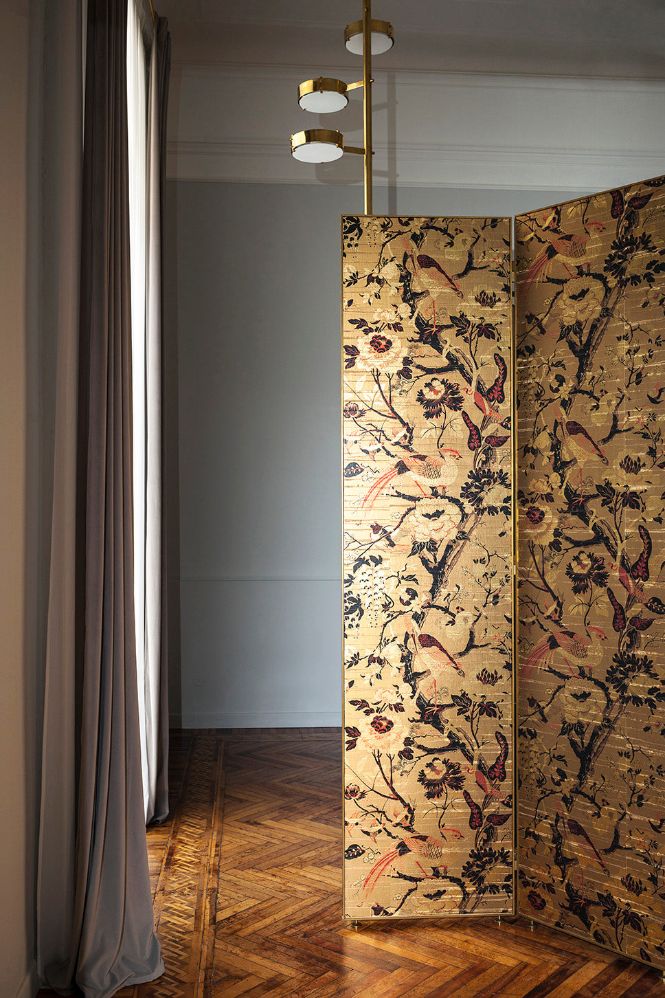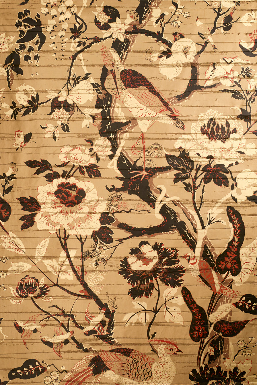 Carta da parati “Silkbird Gold” firmata Dedar Milano, disegno ispirato alle decorazioni dei Coromandel cinesi del XVII secolo, la goffratura conferisce un effetto tridimensionale. Disponibile in 2 varianti di colore (venduta a rotolo di 6 m).