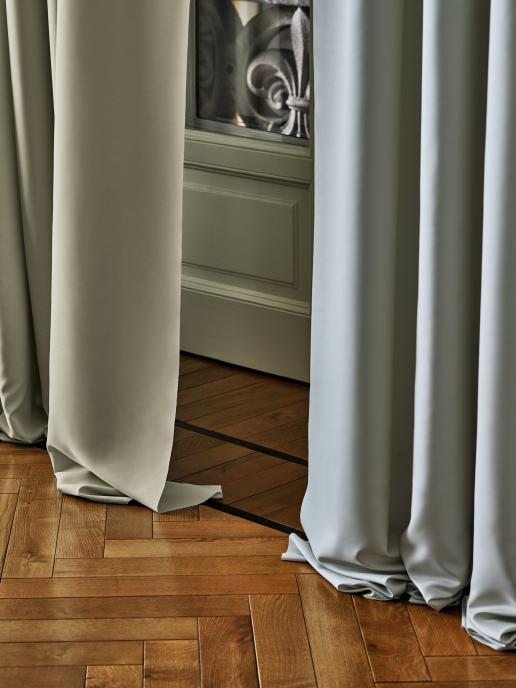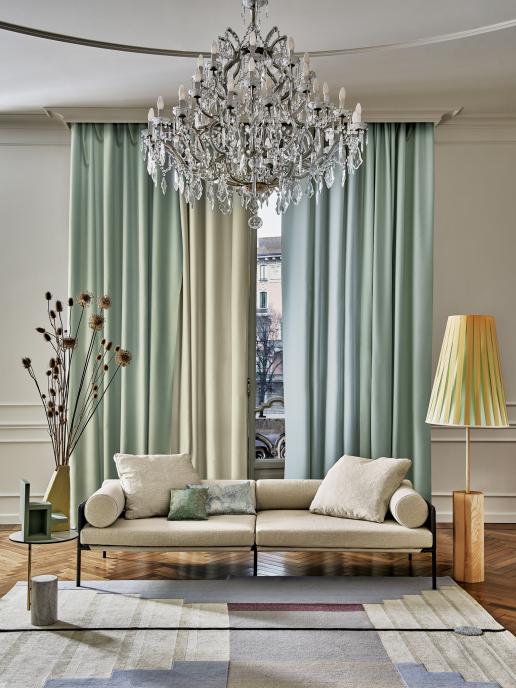Tessuto per tendaggi "Agrippina" firmato Rubelli Venezia, ha l'aspetto e la mano della seta ma è realizzato in Trevira CS; disponibile in una palette di 16 colori pastello.