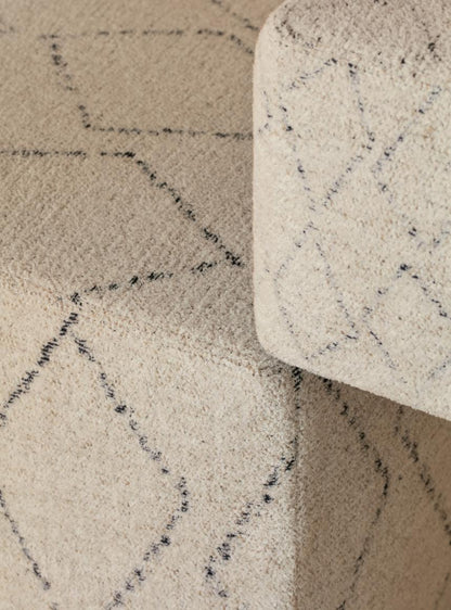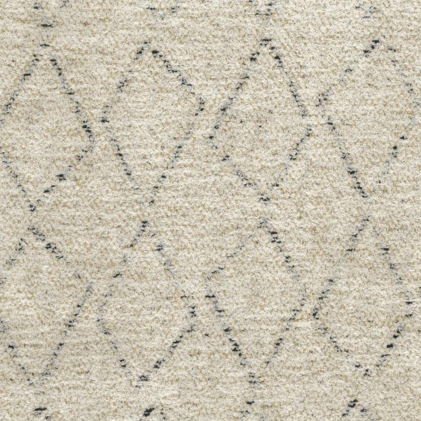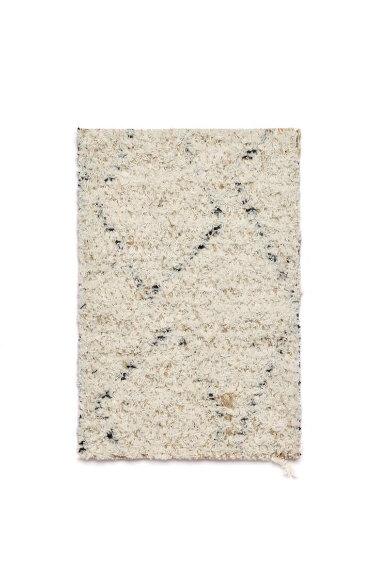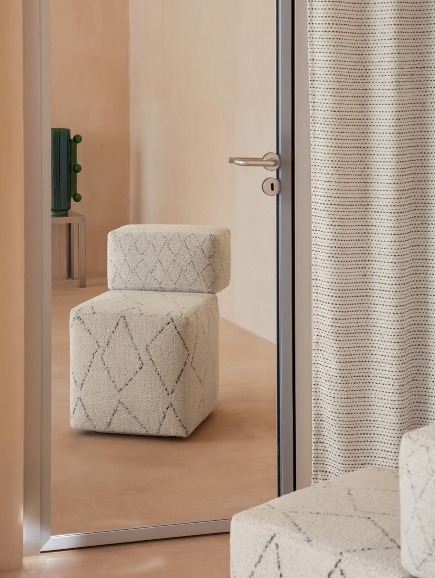 Jacquard in juta e cotone tagliato. A differenza della ciniglia, che è un filo tutto peloso e a densità costante, nel cosiddetto “filo tagliato” la densità e l’altezza del pelo cambiano: questo produce una certa irregolarità. Amazigh Small presenta un disegno geometrico a piccoli rombi irregolari che ricorda i motivi tipici dei kilim berberi. È disponibile nel solo colore naturale, come Amazigh e Amazigh Large.