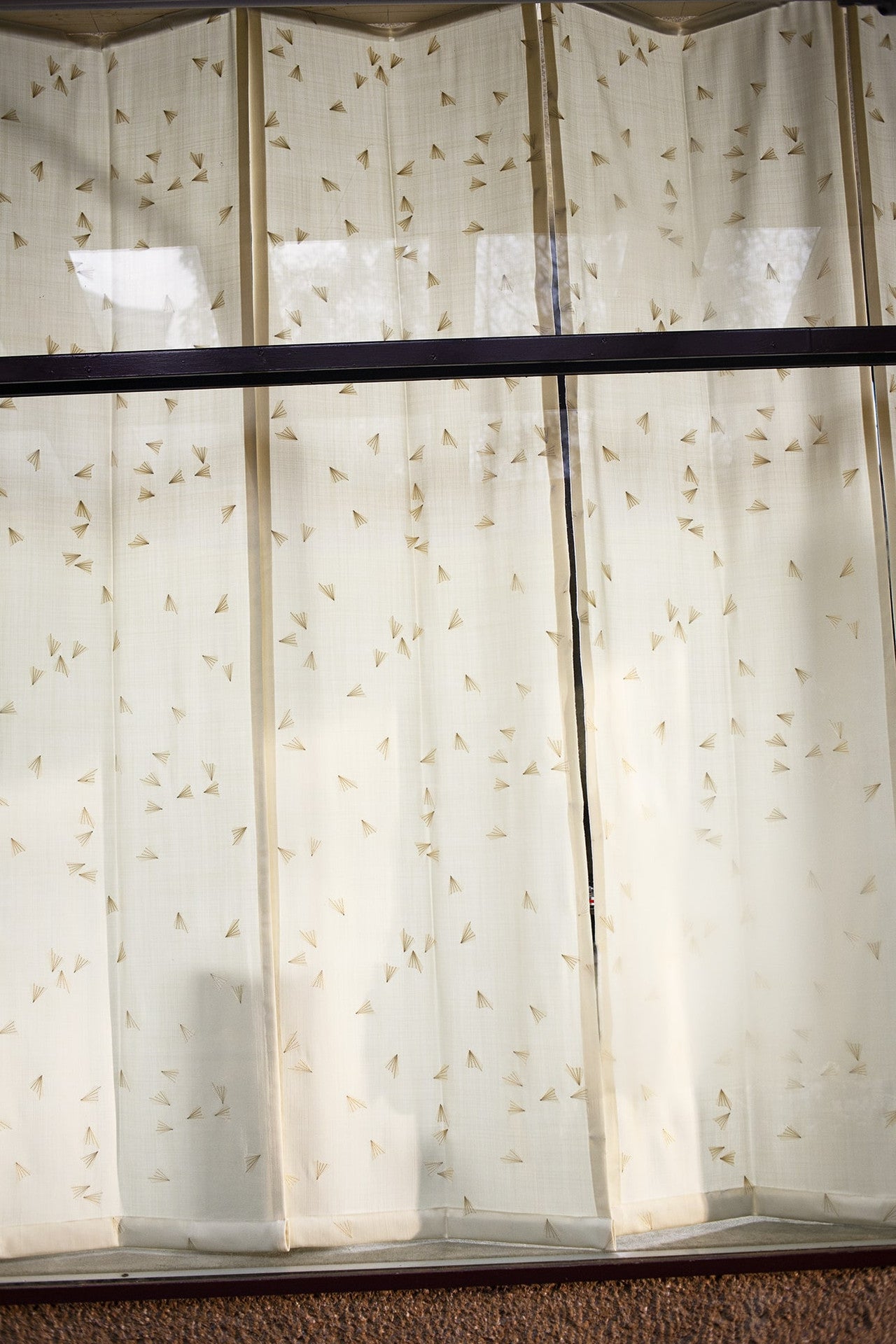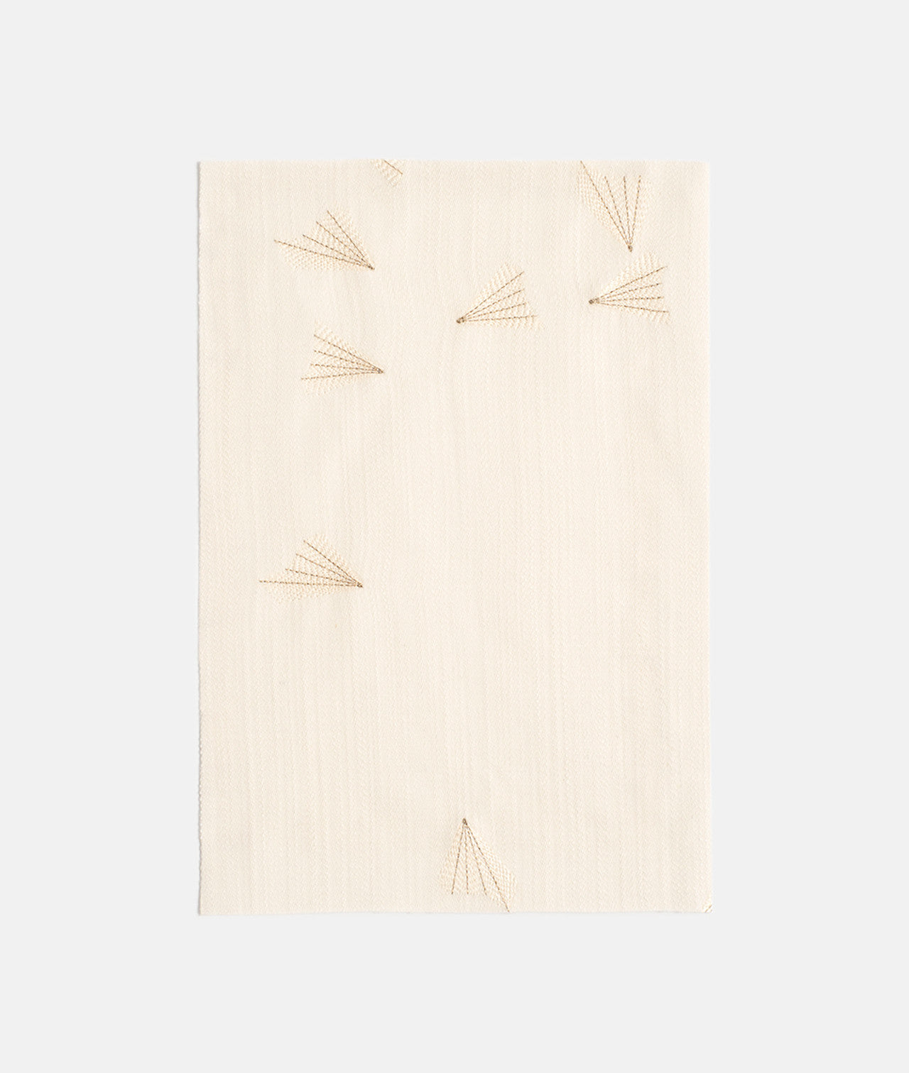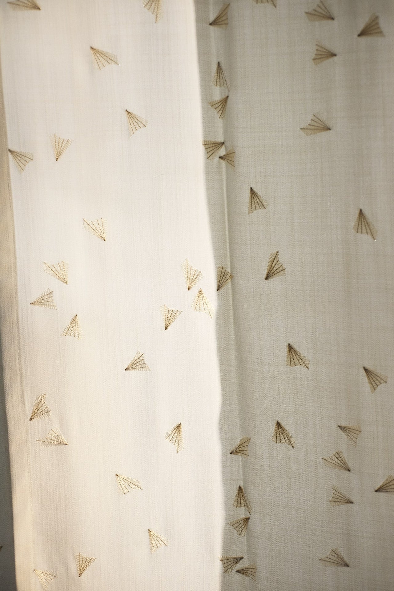 Delicati decori ricamati fluttuano danzanti e si posano con moto casuale su un raso materico in pura lana vergine: sono farfalle, soffioni, samare. Impreziosite da echi metallici, candide impunture tono su tono in filo lucido tracciano il ricamo minuzioso, esaltato dalla discreta opacità del fondo. Dalla mano morbida e la caduta rigorosa, è adatto a uso tenda.