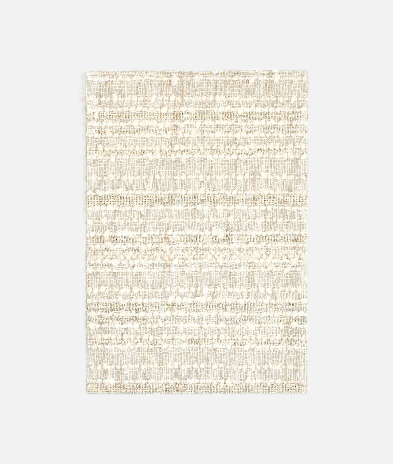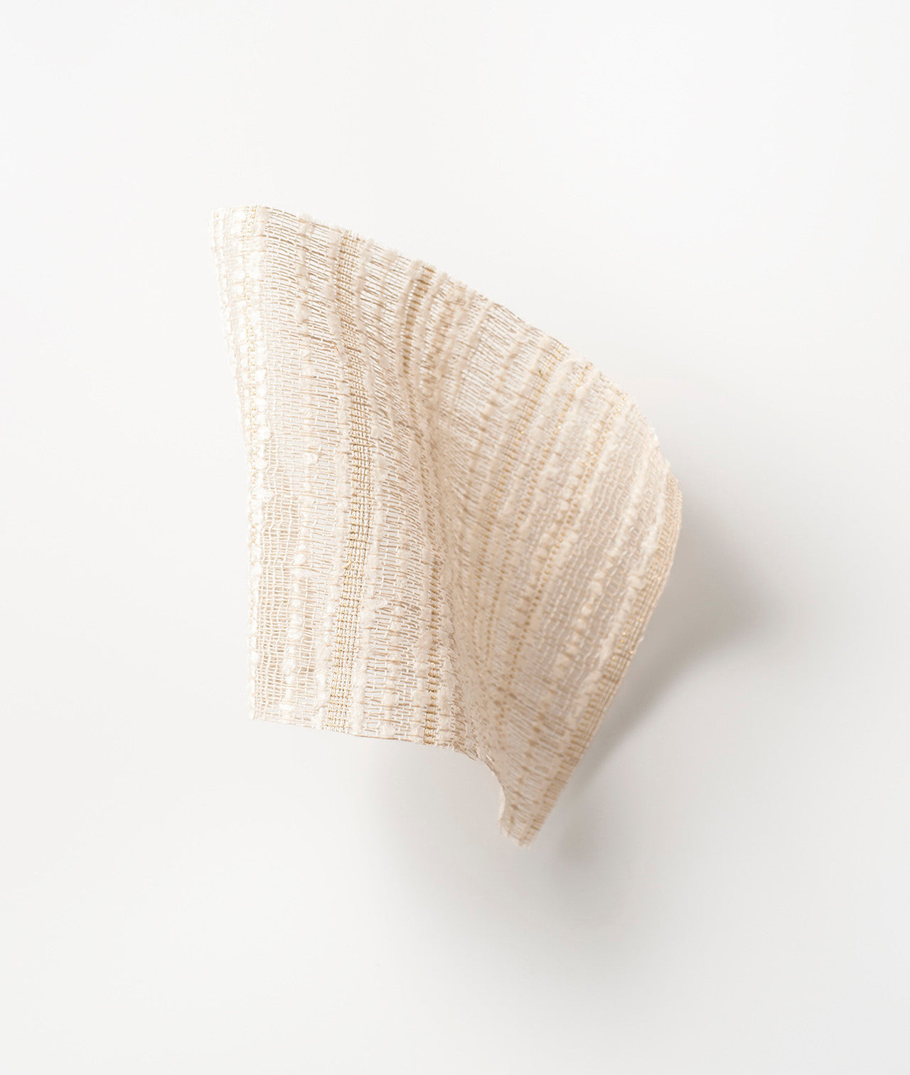 Matericità e trasparenza si fondono in un dolce contrasto espressivo: si susseguono chiaroscuri su un velo ricco di movimento. Un barré intreccia una bouclette di lino libera e trame alternate con un finissimo filo dorato. Tela e raso creano piccole slegature che agitano la superficie e lasciano filtrare la luce. Filati e intrecci ricercati testimoniano un sapere artigianale accurato. Con mano morbida, ha un’altezza di 200 cm per ampi tendaggi.