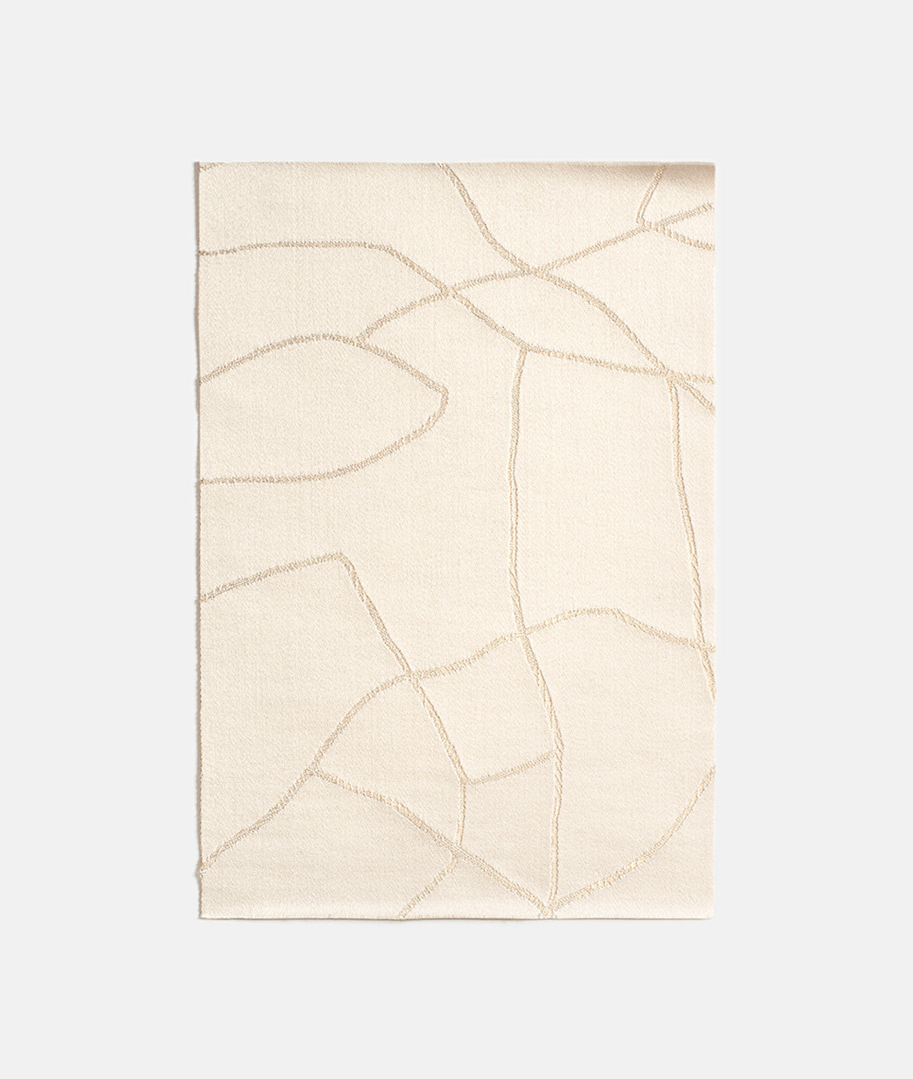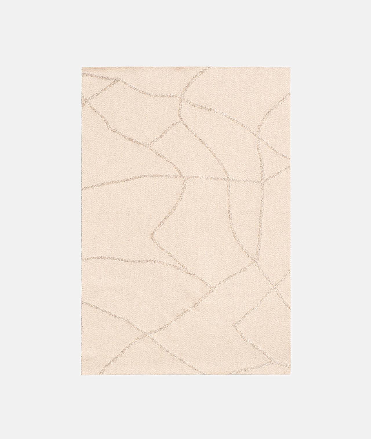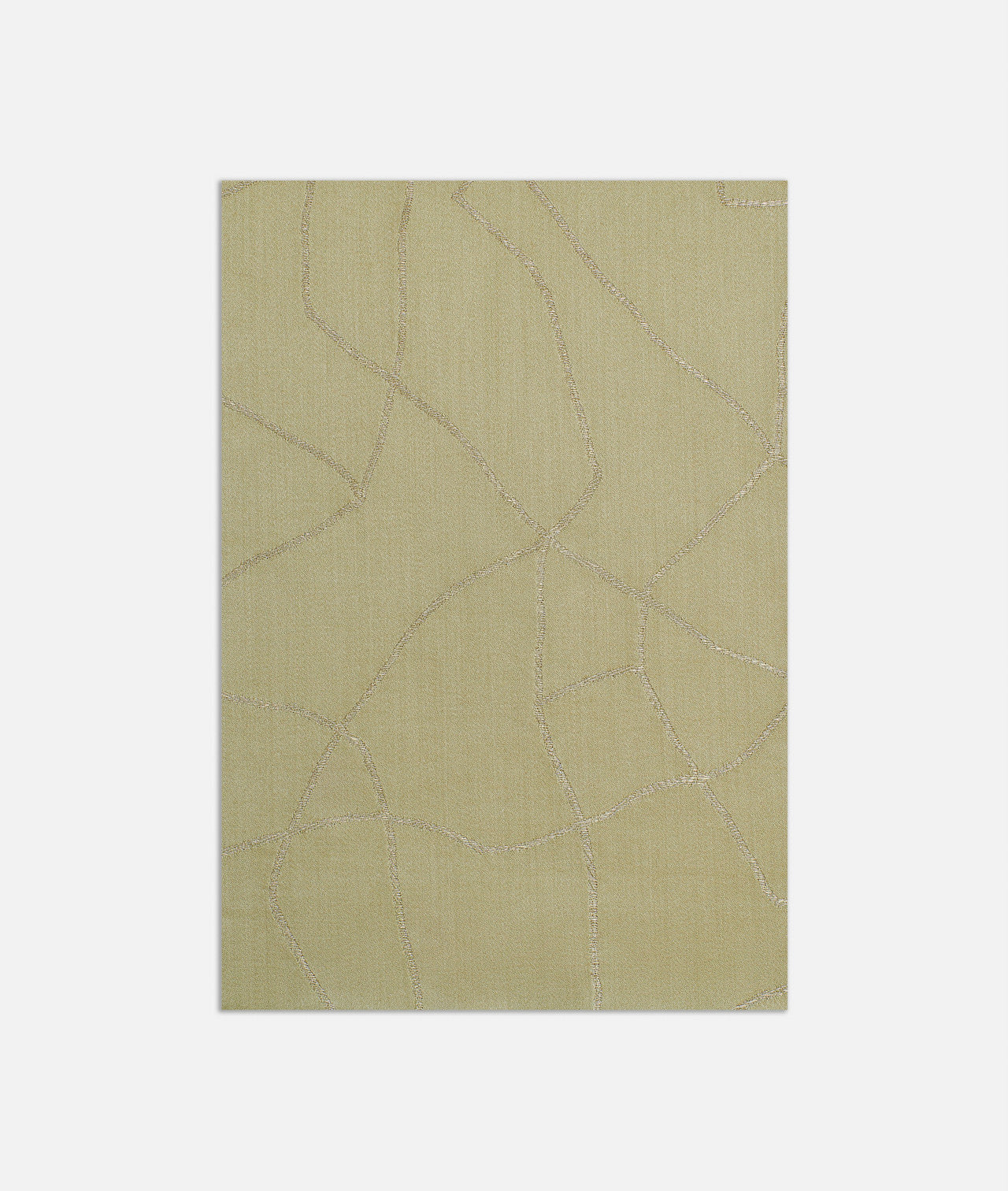 Un raffinato cretto jacquard tinto filo anima un raso liscio in seta e lana a colori tenui. In equilibrio tra tradizione, gioiello e natura preziosa, è l’evocazione contemporanea e stilizzata di sontuosi lampassi antichi, tra trame metalliche ed effetti di luce su un raso vibrante. L’imperfezione delle linee dai toni brillanti fa eco all’antica arte del kintsugi, che trasforma e impreziosisce le fratture della materia. Dalla mano piena e fluida, è adatto a uso tenda.