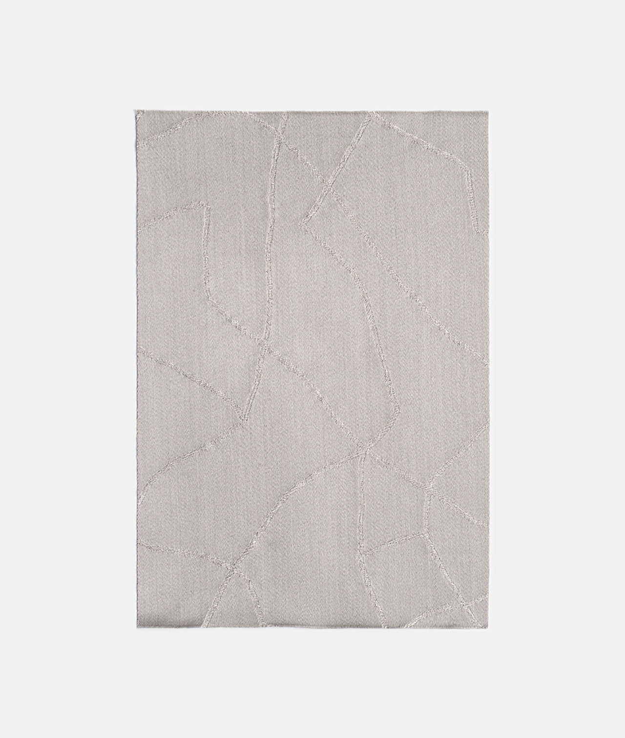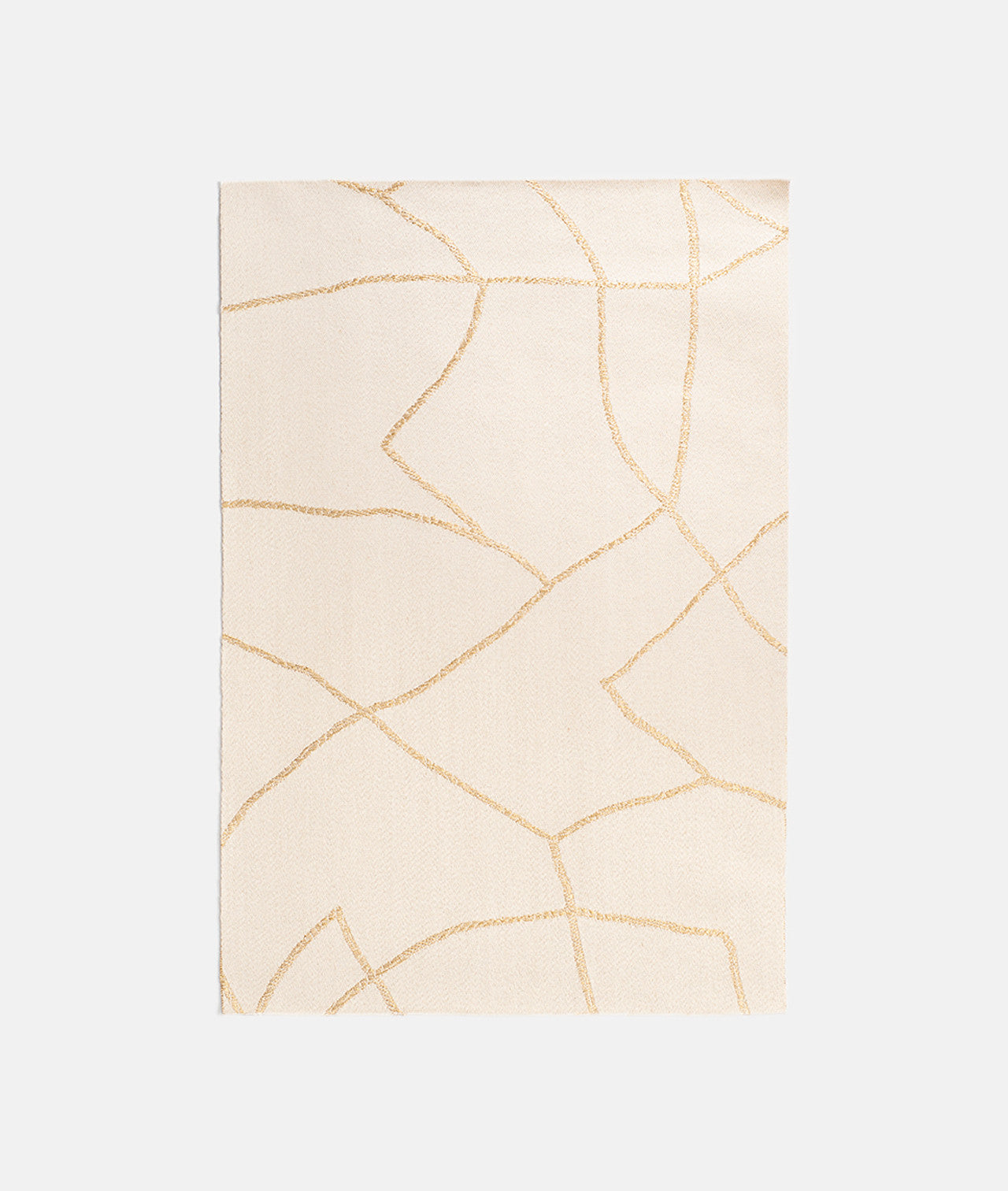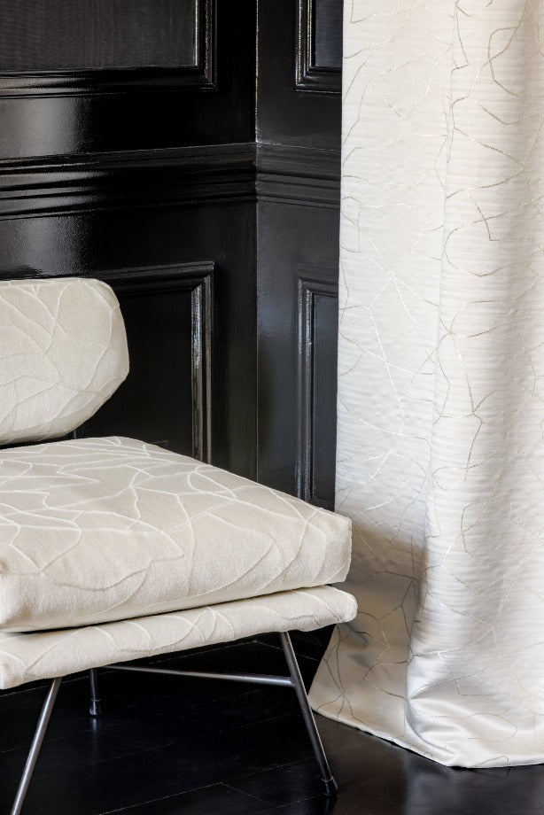Un raffinato cretto jacquard tinto filo anima un raso liscio in seta e lana a colori tenui. In equilibrio tra tradizione, gioiello e natura preziosa, è l’evocazione contemporanea e stilizzata di sontuosi lampassi antichi, tra trame metalliche ed effetti di luce su un raso vibrante. L’imperfezione delle linee dai toni brillanti fa eco all’antica arte del kintsugi, che trasforma e impreziosisce le fratture della materia. Dalla mano piena e fluida, è adatto a uso tenda.