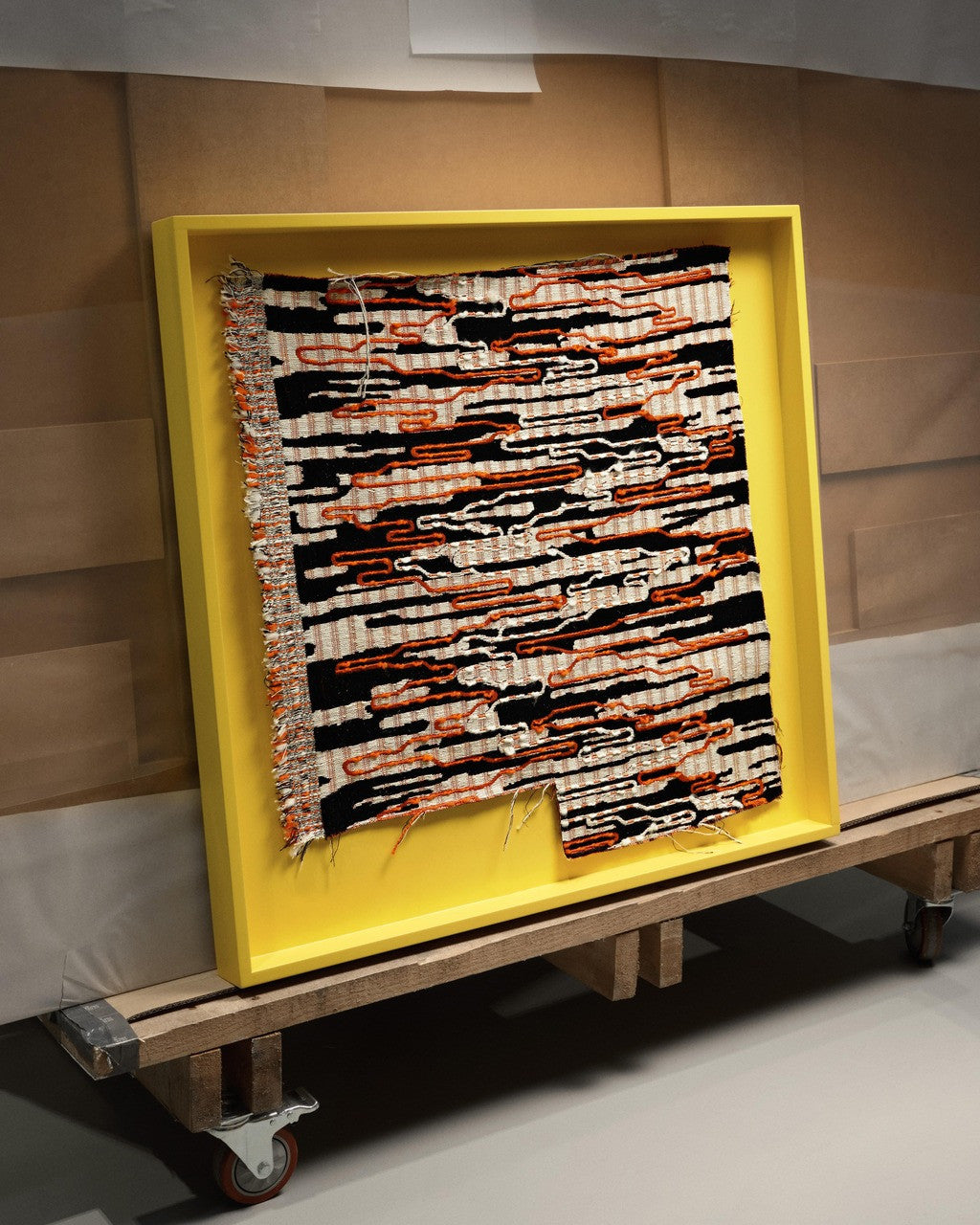 Una linea “a spasso senza meta”, diceva Albers, su un intreccio jacquard composito di filati, armature e colori. La lana improvvisa una traiettoria su un raso di cotone e trame di juta, tracciando un motivo a metà tra calligrafia e passeggiata. Un grosso filo di lana ondé lavorato a fil coupé, la vivacità cromatica e una tecnica sapiente danno tridimensionalità a un’immagine che si legge come un dipinto. Il forte aspetto materico richiama tutta la bellezza della tessitura manuale. Per uso tenda, tesatura, seduta e decorativo. In collaborazione con la Fondazione Josef & Anni Albers.